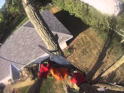 Roping off a limb that's hanging over house (easy breezy) (2013) - Tree With Branches Hanging Down - Helmet camera footage of Micah cutting off a roped tree branch that was hanging toward & over house roof. (2013)