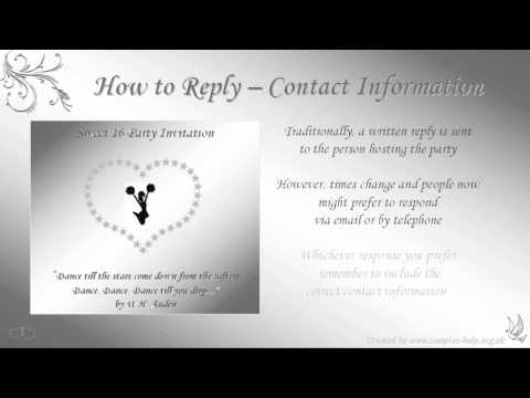 Sweet 16 Invitation Wording - Invitation Acceptance Quotes - http://www.samples-help.org.uk/sample-invitations/sweet-16-invitations.htm How to write a Sweet 16 Party Invitation! Watch this video for samples, examples, ...